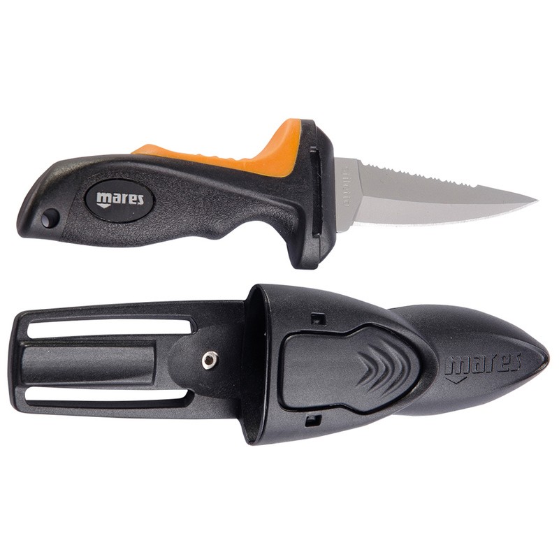 El Cuchillo de Inmesión Mares Stiletto cuenta con una hoja de acero inoxidable 420A de 4 mm de grosor con tratamiento PVD, longitud de la hoja: 65 mm y diseño compacto con mango ergonómico. Ideal para pesca submarina y apnea: