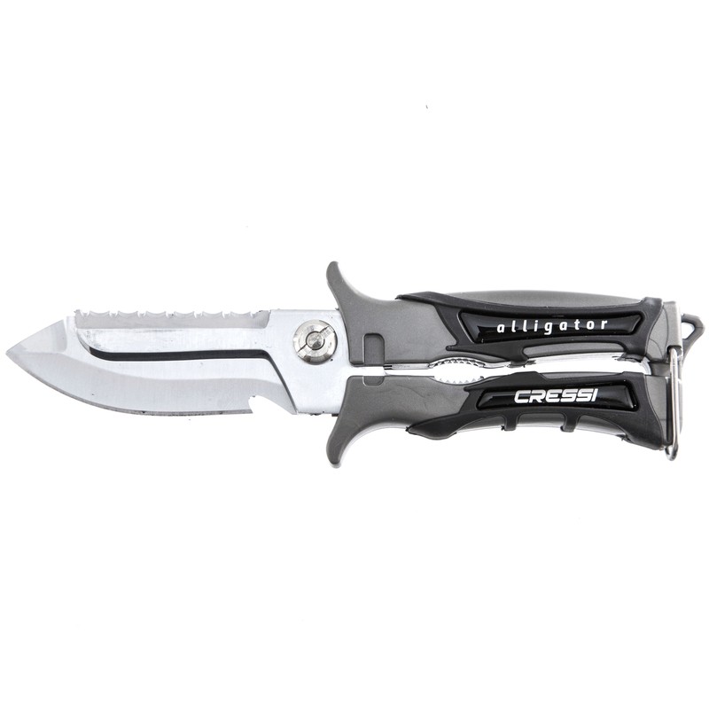 La Tijera Alligator Cressi es un Cuchillo-tijera muy práctico para todo tipo de operaciones bajo el agua. Realizado en acero inoxidable de alta resistencia, es útil como tijera, como cuchillo con filo liso como con sierra, y también cuenta con un rebaje útil como cortacabos.